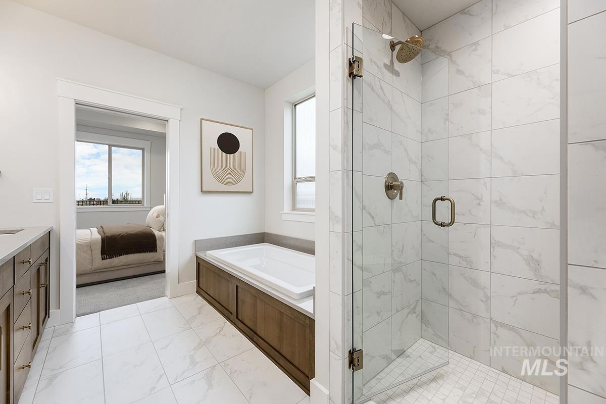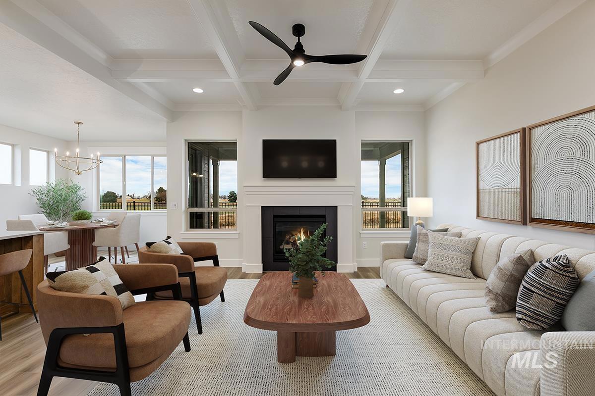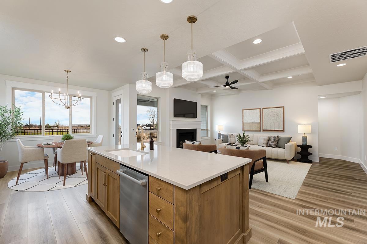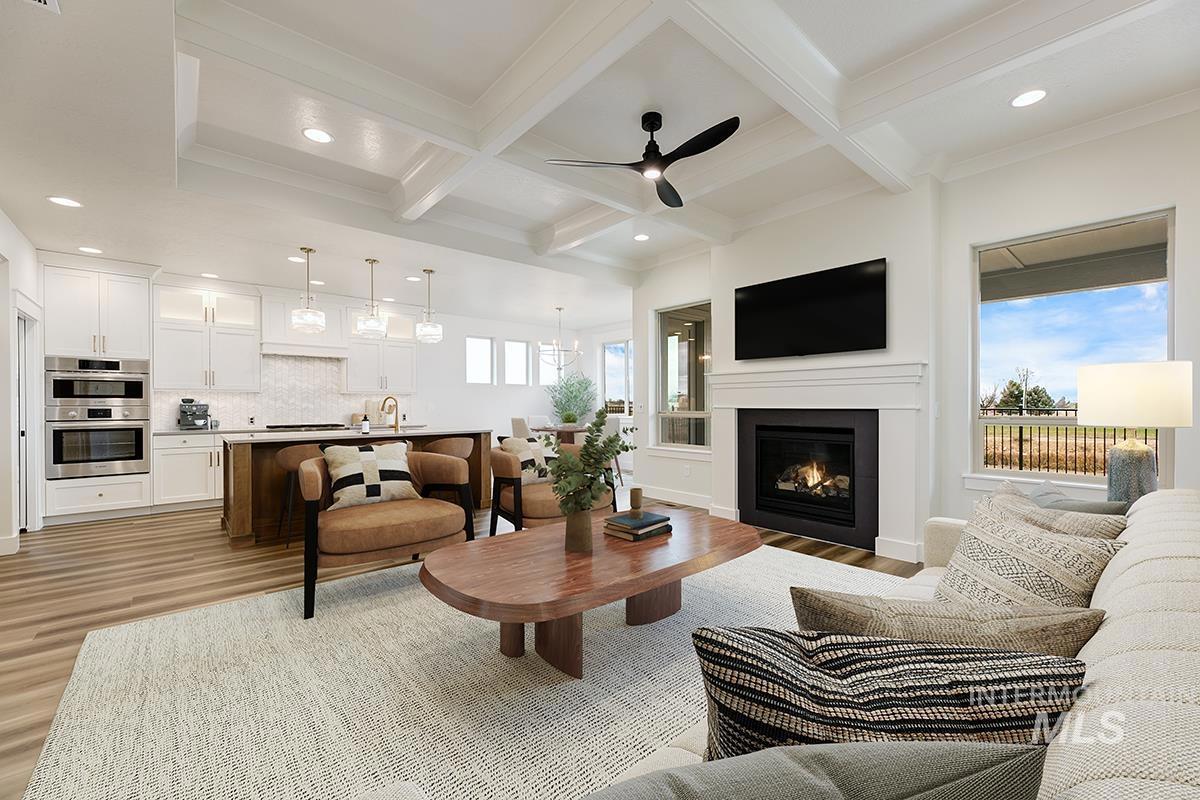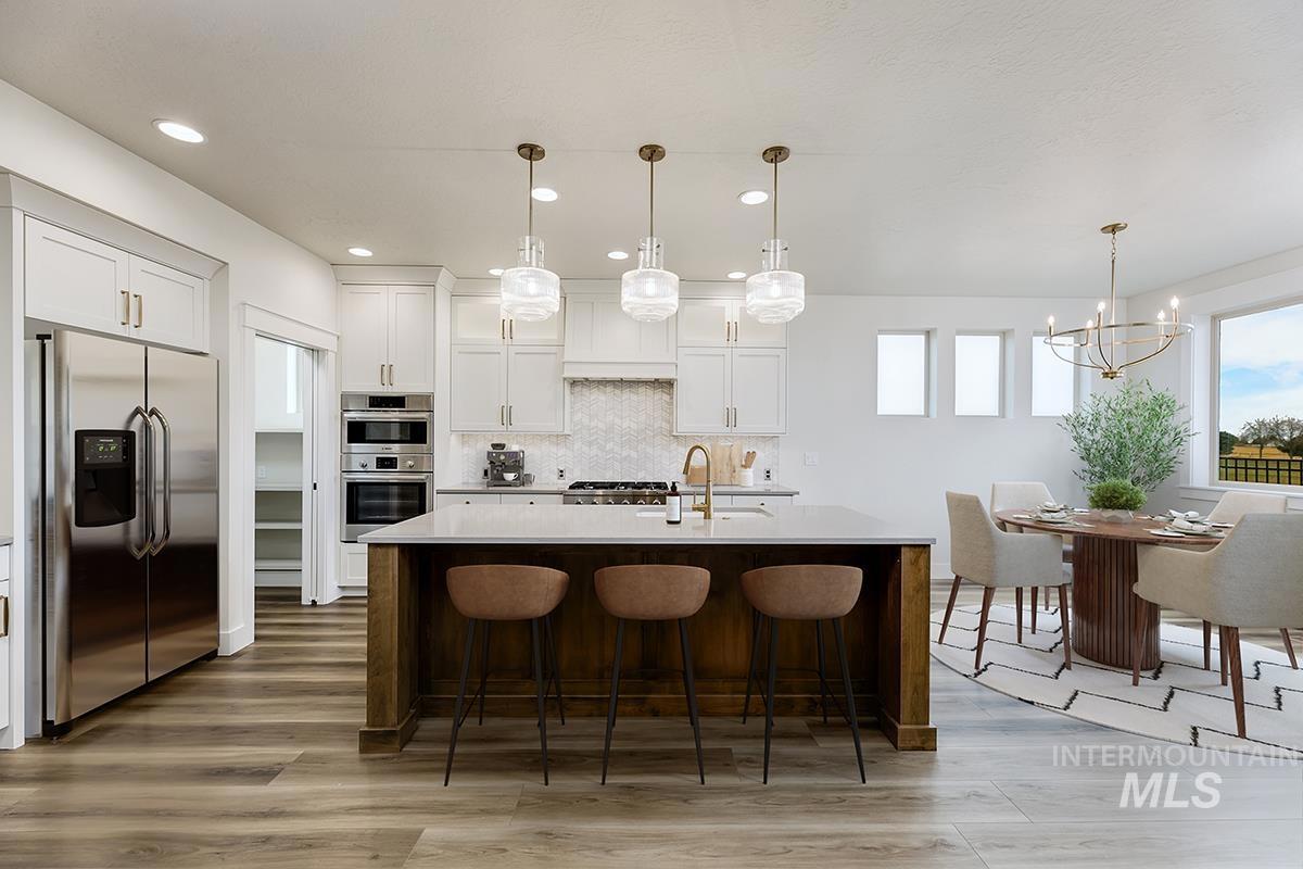 The FOXFIRE MODEL| Blackrock Homes. MOVE -IN- READY! Backing up to seasonal creek w/south facing backyard. Featuring 30` deep RV/Boat Bay with 9` x 11` door. Apart of the Pinnacle Collection at Skybreak- Enjoy COMMUNITY POOL, pickle ball courts, playground + community dog parks! Upgraded finishes include custom cabinets, all quartz countertops, hardwood (lvp), upgraded trim detail including vaulted ceiling w/ stained beams in living room, SS appliances including built-in 5 burner industrial gas range, built in oven, microwave & dishwasher. Walk-in butler`s pantry + tons of additional storage throughout. Light & airy floor plan w/lots of natural light & cozy fireplace. Tile floors in laundry, secondary & primary baths.