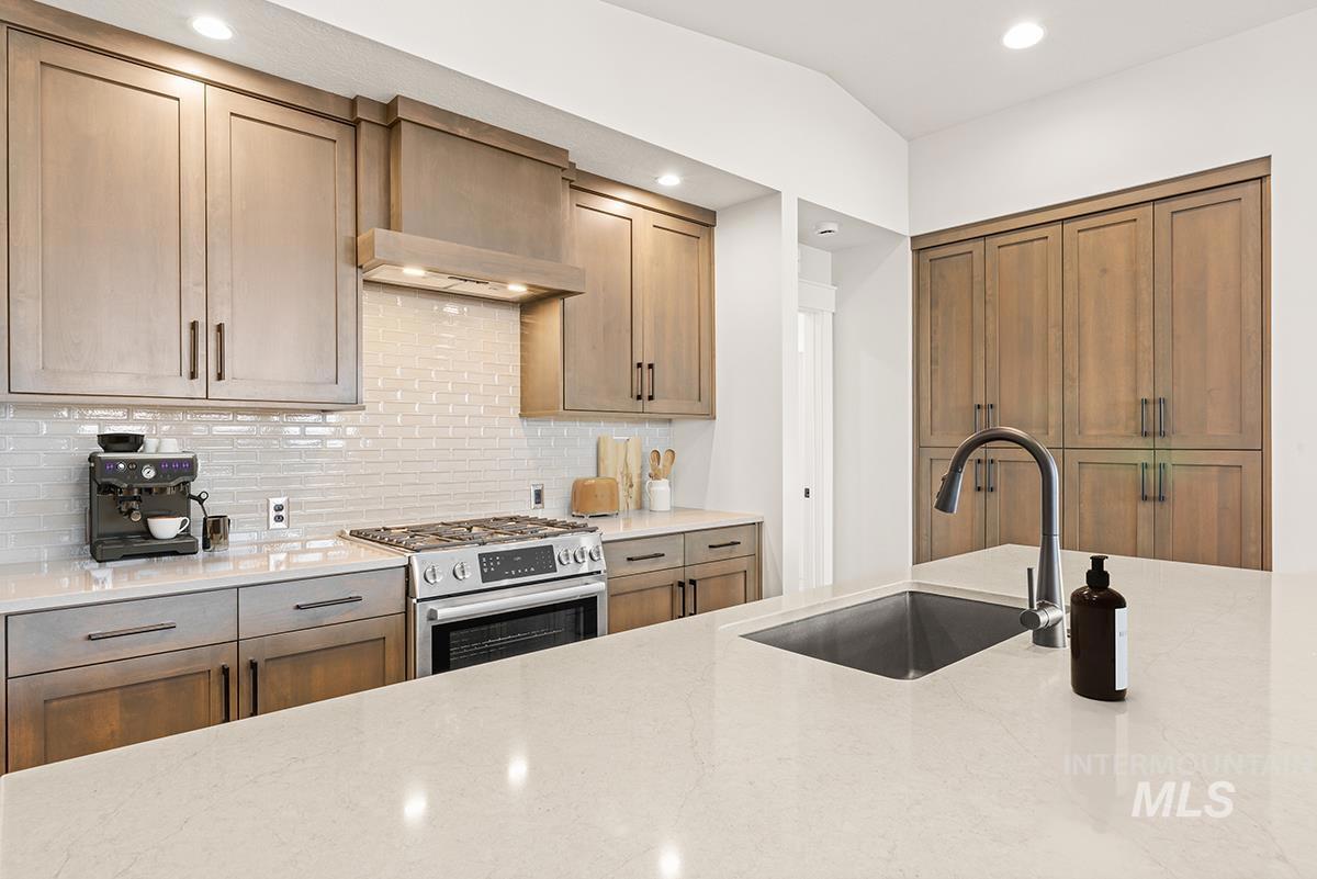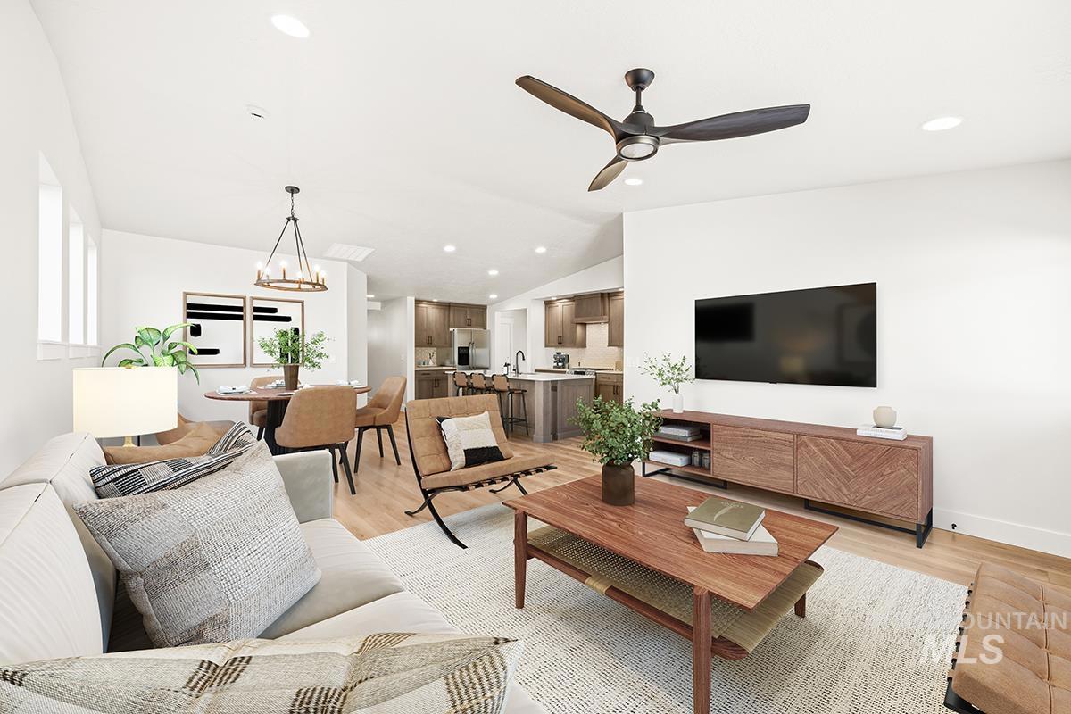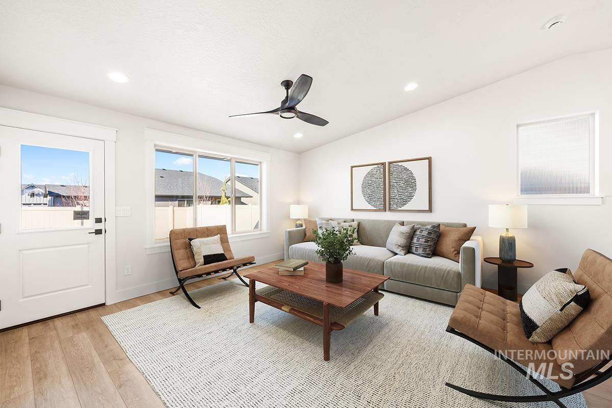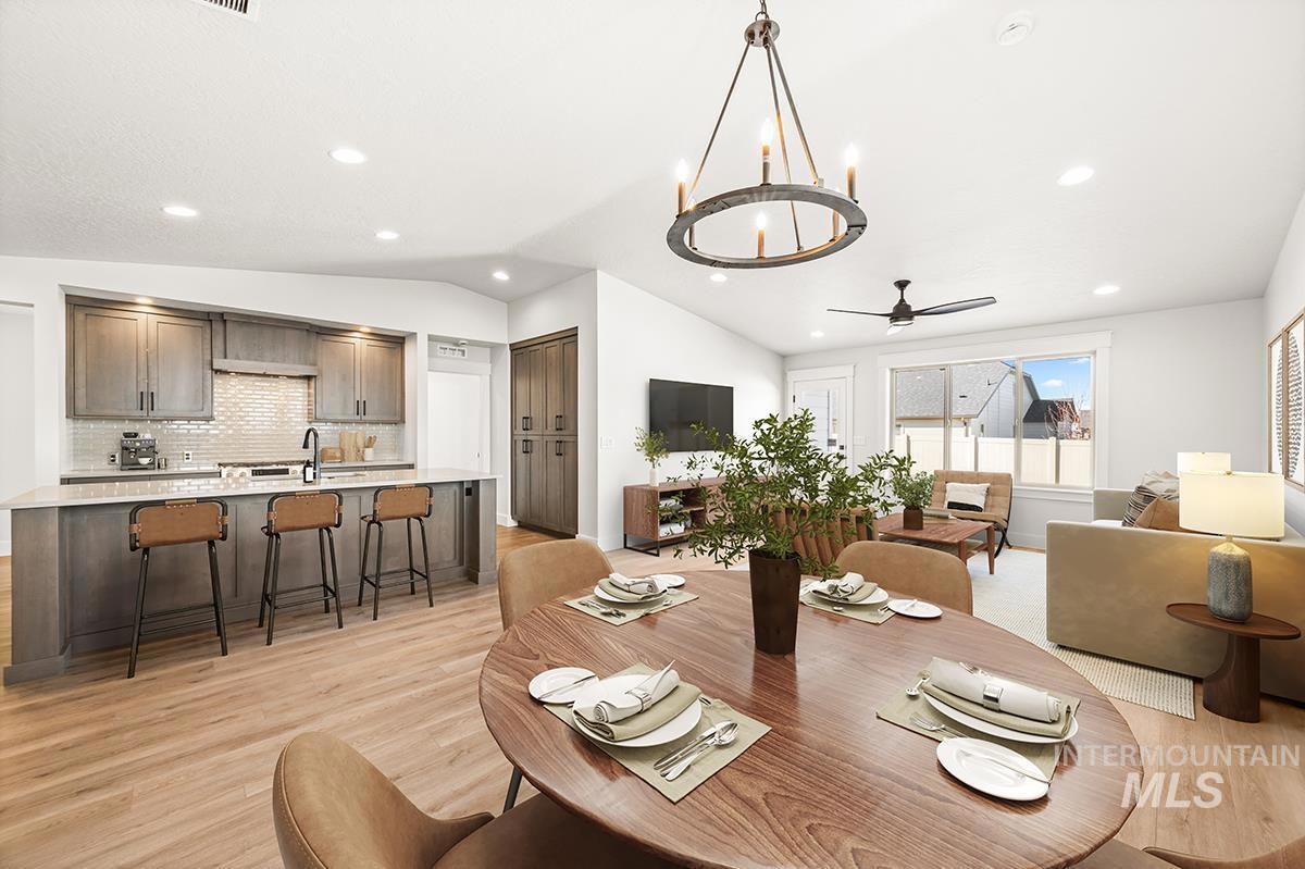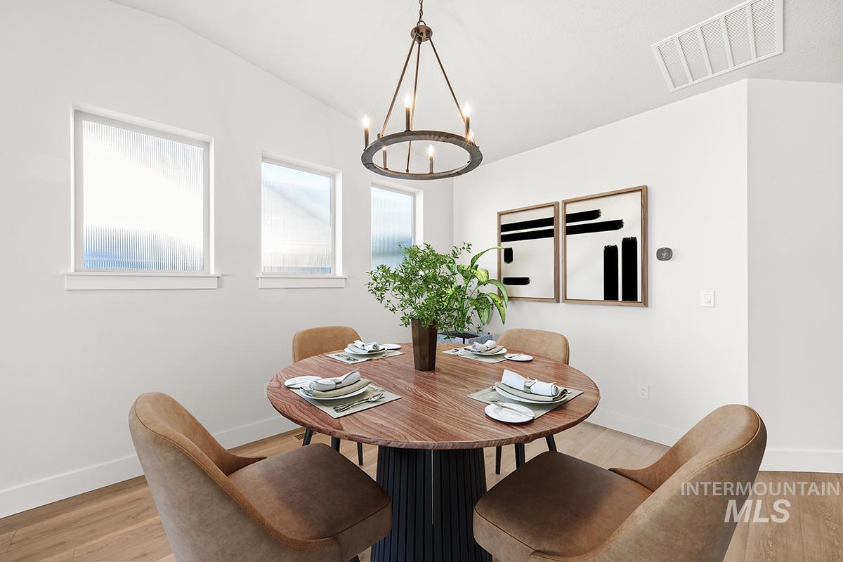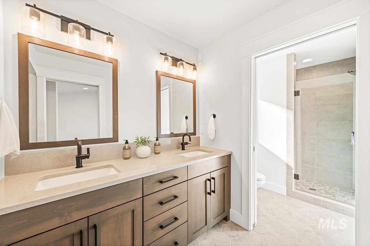 The PEORIA- SHOP MODEL| Blackrock Homes. End home w/ only one side neighbor. Enjoy COMMUNITY POOL, pickle ball courts, walking paths, community dog parks & playground. Located in the gated neighborhood: The District at Skybreak Estates w/private pickle ball court, dog park & private streets. Featuring elevated finishes; upgraded cabinets, Bosch appliances, upgraded lighting plumbing & flooring. Baths feature tile floors, tile showers & under mount sinks. Generous sized great room, kitchen & dining room perfect for entertaining. Private guest suite & 3rd bdrm or office space gives you everything you need and nothing you don`t. Oversized garage w/additional 17` x5` shop space in garage- perfect for storage, work bench, home gym, etc. Keyless door lock on front. INCLUDES FULL VINYL FENCING & FRONT & REAR YARD SPRINKLERS & LANDSCAPING. Just Blocks away from Discovery park. Easy access to YMCA, the interstate, Meridian, shopping, dining, & entertainment. * photos of same quality of construction but not of actual selections. Selections are Medi package